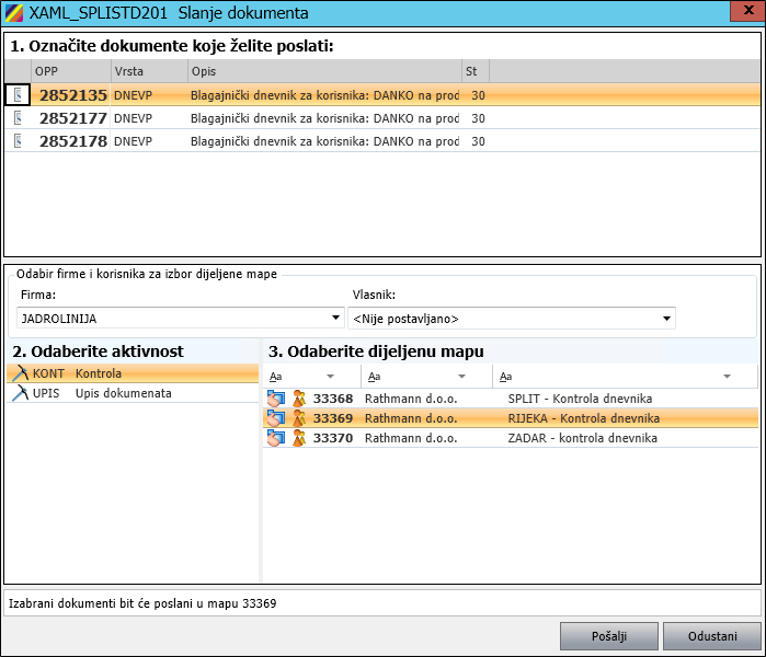 - Odaberite mapu u koju treba poslati dnevnike prodaje i kliknite na Pošalji. Mapa u koju se šalje dokument određuje se prema blagajni kojoj pripada dokument dnevnika.