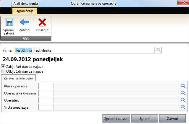 - za sve najave osim za: klasa operacije, operacijska dvorana, operater, vrsta anestezije