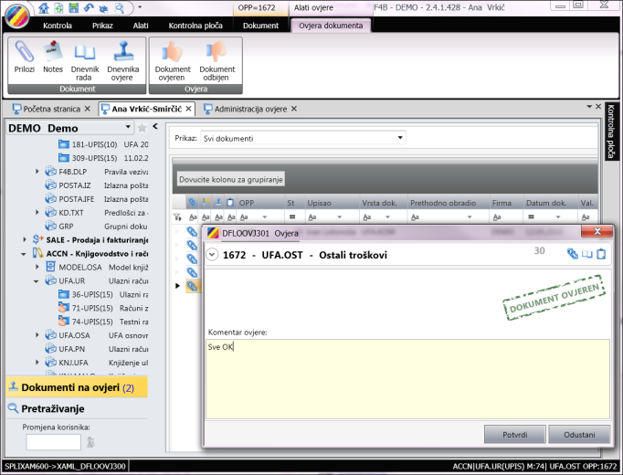 Korisnik ovjerava ili osporava dokument nakon pregleda priloga s F9, klikom na Dokument ovjeren,