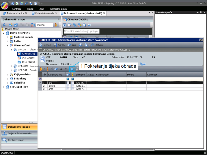 Osoba zadužena za Protokol ulaznih računa može pratiti kod koga se dokument trenutno nalazi na ovjeri (stupac Kontrolira u pregledu mape ulaznih faktura). Kada su svi korisnici ovjerili dokument, simbol ovjere se mijenja