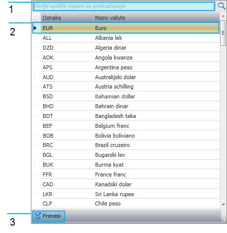 | 1 | Polje za upis pojma za pretraživanje | Polje za upis pojma za pretraživanje. Moguć je upis dijela pojma, npr. %ro, cijelog pojma npr. eur ili upis znaka % za dohvat svih zapisa. |